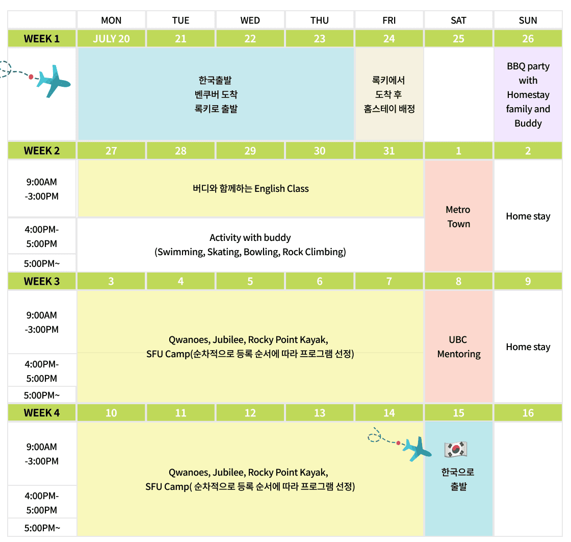 26년 캐나다 벤쿠버 여름방학 캠프 일정