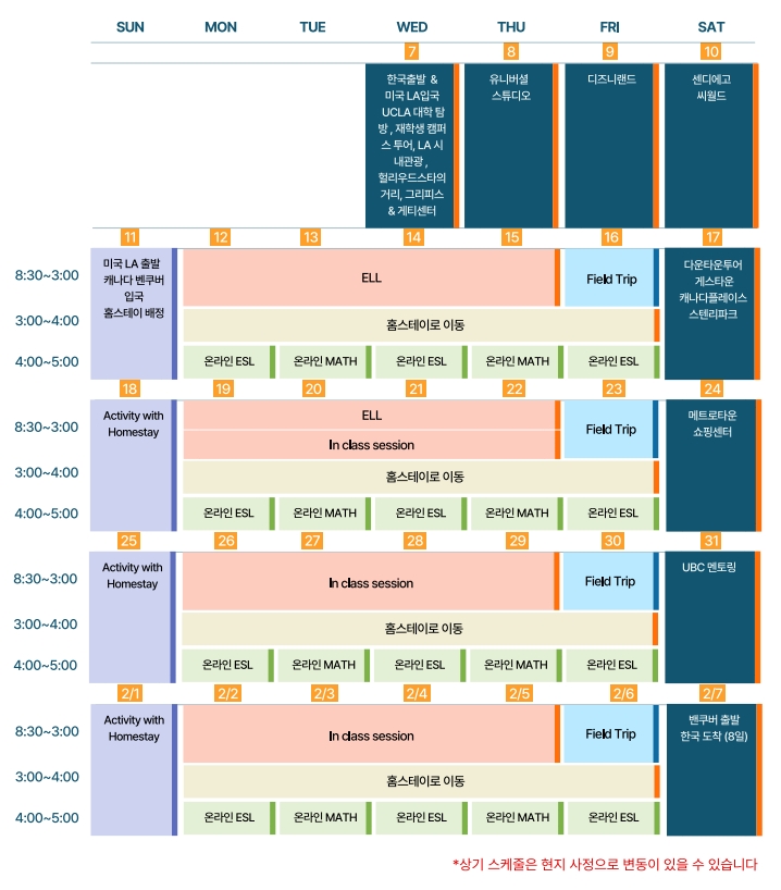 - 이 프로그램은 한국식 ESL 수업이 아닌, 현지 학생들과 동일하게 정규 수업을 듣는 방식으로 운영됩니다.