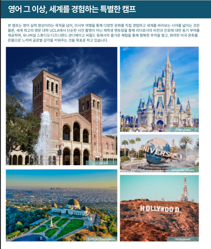 - 미국 아이비리그 탐방 (4박5일)동안 아이들의 시차 적응과 성향을 파악할 수 있으며 미국 엘에이와 샌디에고에서 가장 유명한 관광지(디즈니랜드, 유니버셜스튜디오, 시월드등)탐방
