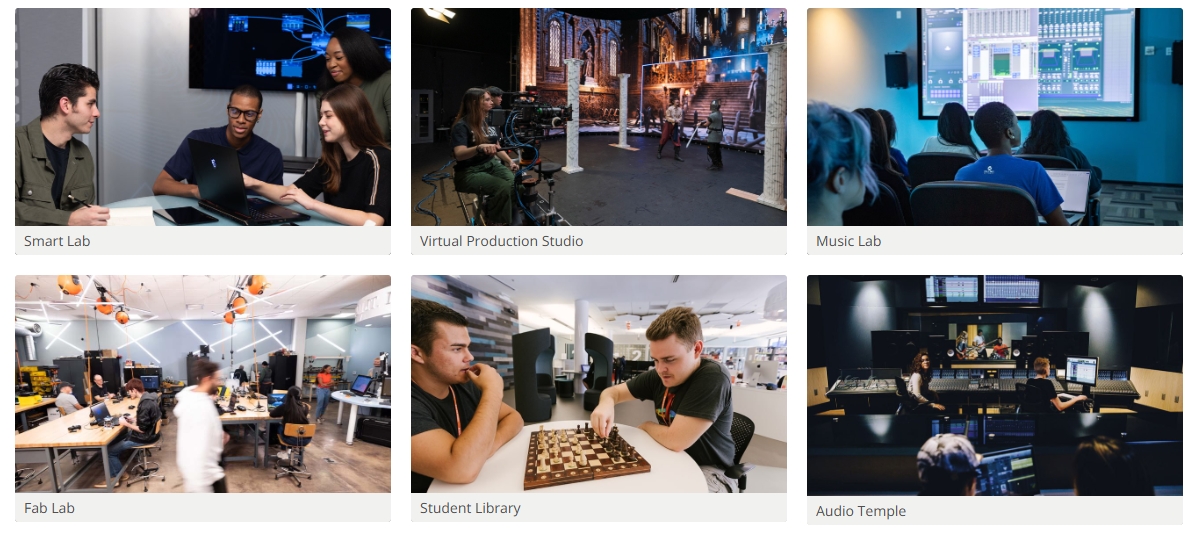 - 영화 스튜디오, 게임 개발실, 사운드 스테이지 등 실습 시설이 매우 우수합니다.