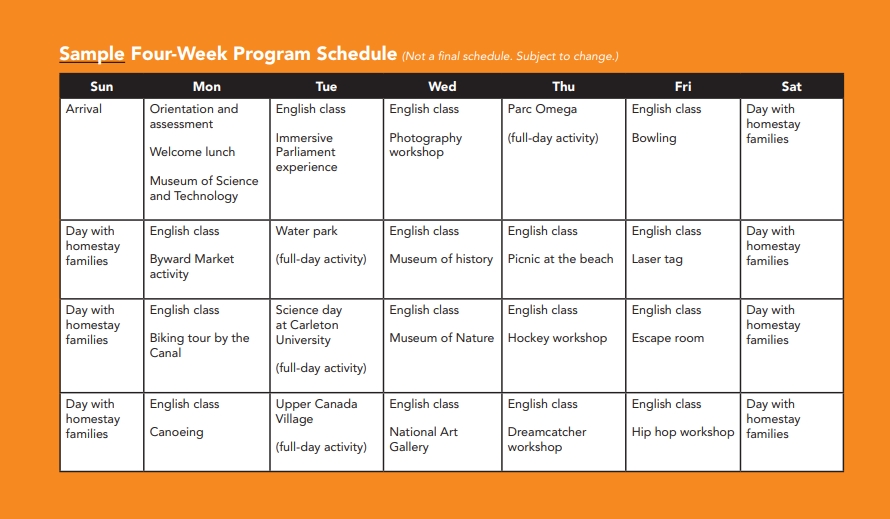 오타와-칼턴 교육청(OCDSB)과 칼턴 대학교는 캐나다 수도에서 유학생들에게 특별한 학습 경험을 제공합니다. 26년 여름방학캠프를 위해서 칼튼대학교의 STEM 실습 워크숍을 결합했습니다. 학생들은 프로그램 기간 동안 대학교 기숙사에서 생활하며, 몰입적이고 흥미로운 일상 활동에 참여하여 지속적인 기술을 함양하고 소중한 추억을 만들 수 있습니다. 오타와는 다양한 야외 활동을 위한 광활한 자연 공간과 활기찬 예술 및 음악 축제를 제공합니다. 캐나다 여름 영어 방학 프로그램은 유럽 공통 기준(CEFR)을 준수하는 양질의 영어 교육과 교실 밖에서도 언어 학습을 확장하는 일상 활동을 결합합니다. 엄선된 홈스테이 가정은 방문 학생들에게 안전하고 따뜻한 환경을 제공합니다