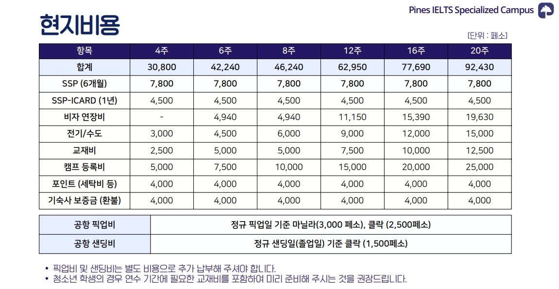 필리핀 바기오 어학연수 청소년 IELTS & 스피킹 코스 학비표